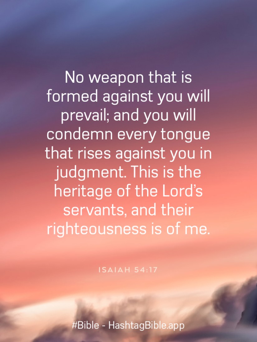 hashtagbible.app/bible/verse/eyJyZWYiOiJJc2FpYWggNTQ6MTciLCJ0ZXh0IjoiTm8gd2VhcG9uIHRoYXQgaXMgZm9ybWVkIGFnYWluc3QgeW91IHdpbGwgcHJldmFpbDsgYW5kIHlvdSB3aWxsIGNvbmRlbW4gZXZlcnkgdG9uZ3VlIHRoYXQgcmlzZXMgYWdhaW5zdCB5b3UgaW4ganVkZ21lbnQuIFRoaXMgaXMgdGhlIGhlcml0YWdlIG9mIHRoZSBMb3Jk4oCZcyBzZXJ2YW50cywgYW5kIHRoZWlyIHJpZ2h0ZW91c25lc3MgaXMgb2YgbWUuIiwidGhlbWUiOiJTdW5zZXQgTW91bnRhaW5zIn0