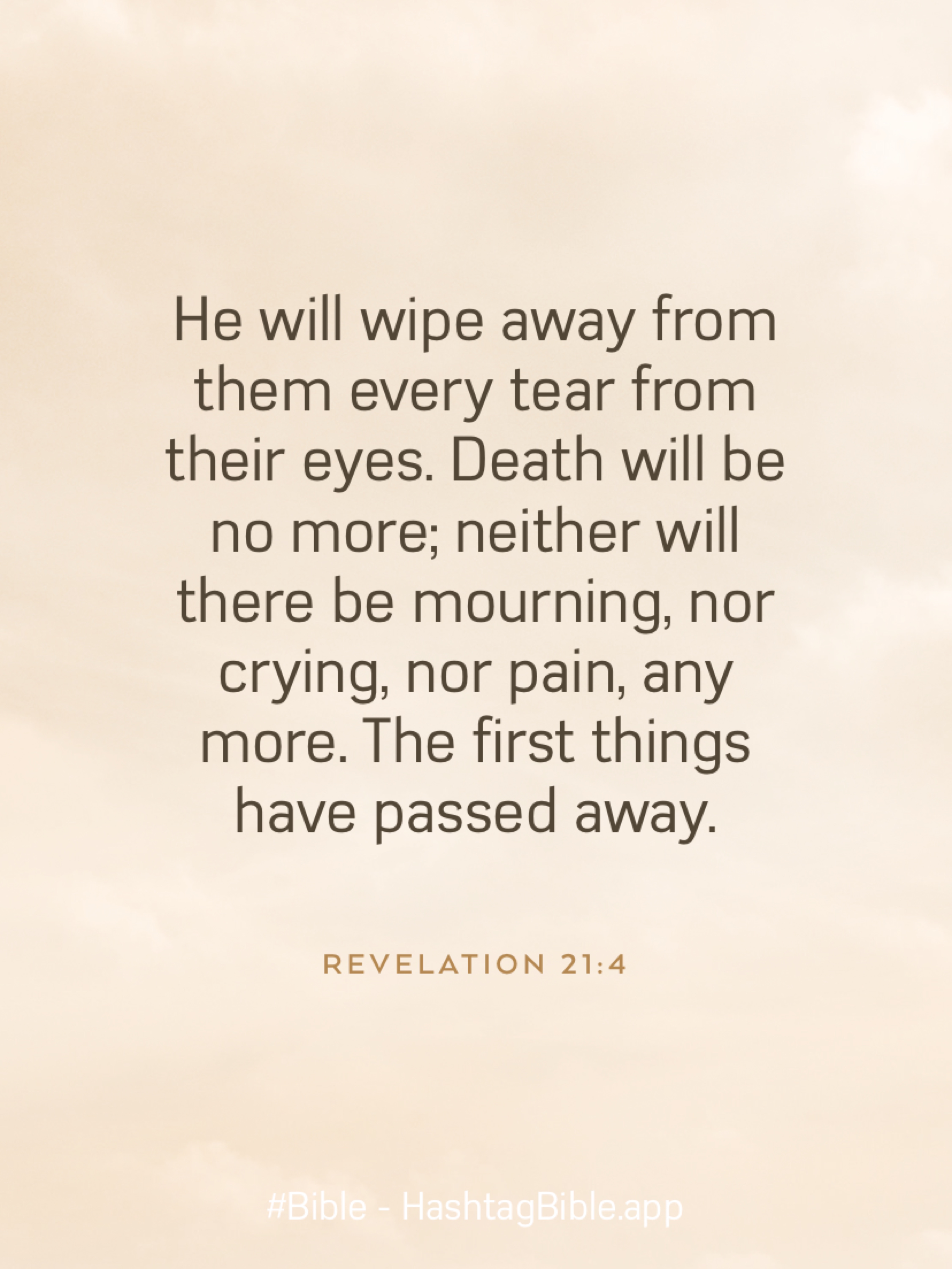 hashtagbible.app/bible/verse/eyJyZWYiOiJSZXZlbGF0aW9uIDIxOjQiLCJ0ZXh0IjoiSGUgd2lsbCB3aXBlIGF3YXkgZnJvbSB0aGVtIGV2ZXJ5IHRlYXIgZnJvbSB0aGVpciBleWVzLiBEZWF0aCB3aWxsIGJlIG5vIG1vcmU7IG5laXRoZXIgd2lsbCB0aGVyZSBiZSBtb3VybmluZywgbm9yIGNyeWluZywgbm9yIHBhaW4sIGFueSBtb3JlLiBUaGUgZmlyc3QgdGhpbmdzIGhhdmUgcGFzc2VkIGF3YXkuIiwidGhlbWUiOiJDbG91ZHkgT2NlYW4ifQ