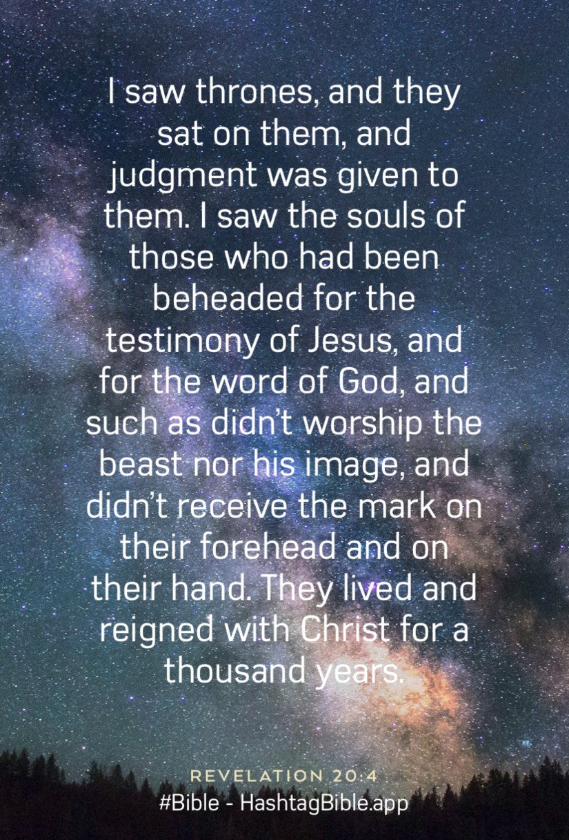 hashtagbible.app/bible/verse/eyJyZWYiOiJSZXZlbGF0aW9uIDIwOjQiLCJ0ZXh0IjoiSSBzYXcgdGhyb25lcywgYW5kIHRoZXkgc2F0IG9uIHRoZW0sIGFuZCBqdWRnbWVudCB3YXMgZ2l2ZW4gdG8gdGhlbS4gSSBzYXcgdGhlIHNvdWxzIG9mIHRob3NlIHdobyBoYWQgYmVlbiBiZWhlYWRlZCBmb3IgdGhlIHRlc3RpbW9ueSBvZiBKZXN1cywgYW5kIGZvciB0aGUgd29yZCBvZiBHb2QsIGFuZCBzdWNoIGFzIGRpZG7igJl0IHdvcnNoaXAgdGhlIGJlYXN0IG5vciBoaXMgaW1hZ2UsIGFuZCBkaWRu4oCZdCByZWNlaXZlIHRoZSBtYXJrIG9uIHRoZWlyIGZvcmVoZWFkIGFuZCBvbiB0aGVpciBoYW5kLiBUaGV5IGxpdmVkIGFuZCByZWlnbmVkIHdpdGggQ2hyaXN0IGZvciBhIHRob3VzYW5kIHllYXJzLiIsInRoZW1lIjoiRm9yZXN0IE1pbGt5IFdheSJ9